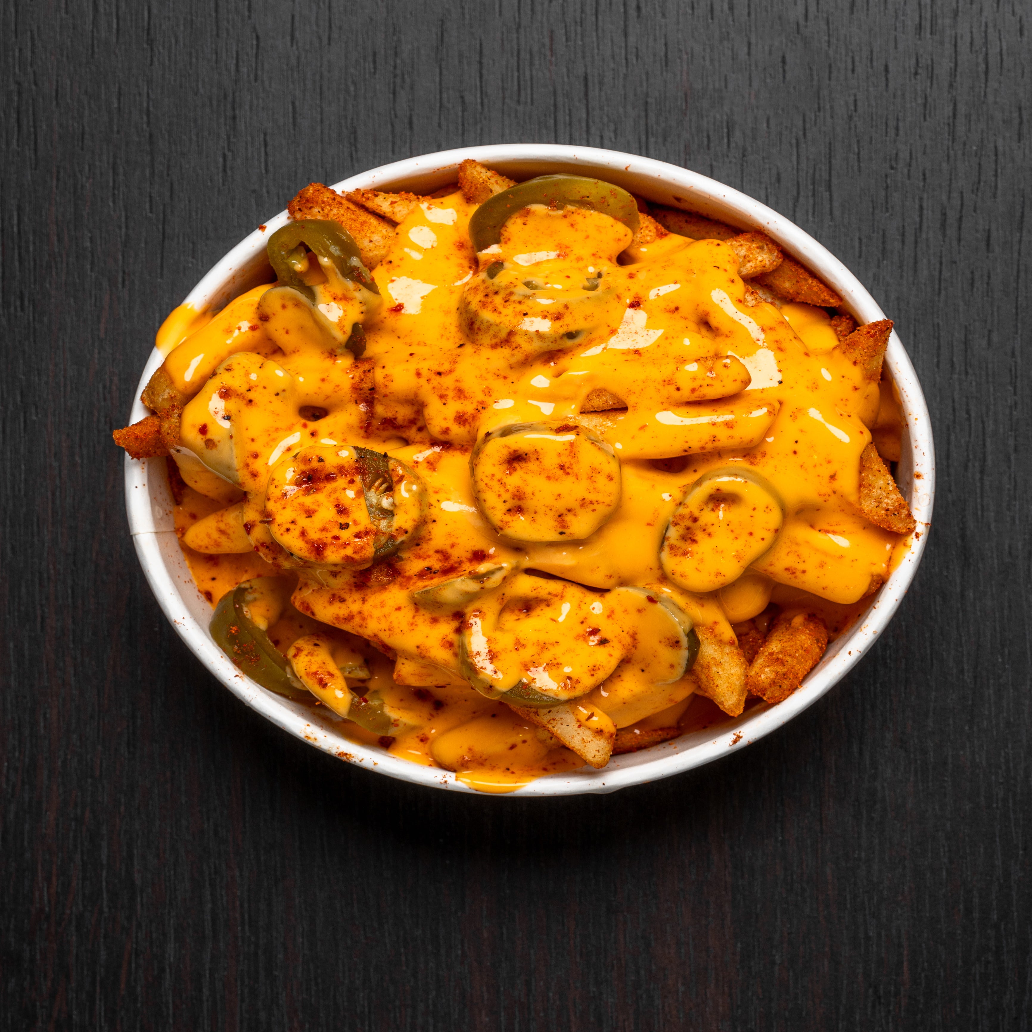 Large Cajun fries portion layered with cheese sauce, jalapeños and sprinkled with Cajun seasoning.