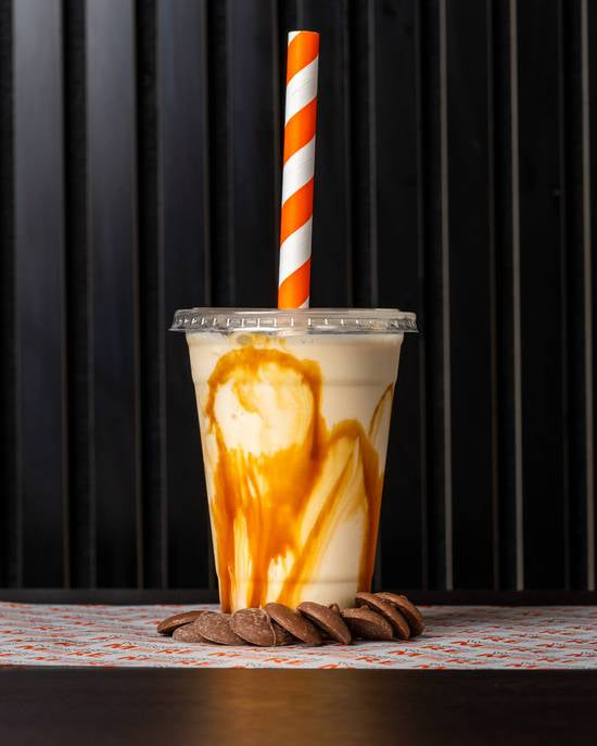 Indulgent milkshake with rich salted caramel, perfect for a sweet and savory treat.